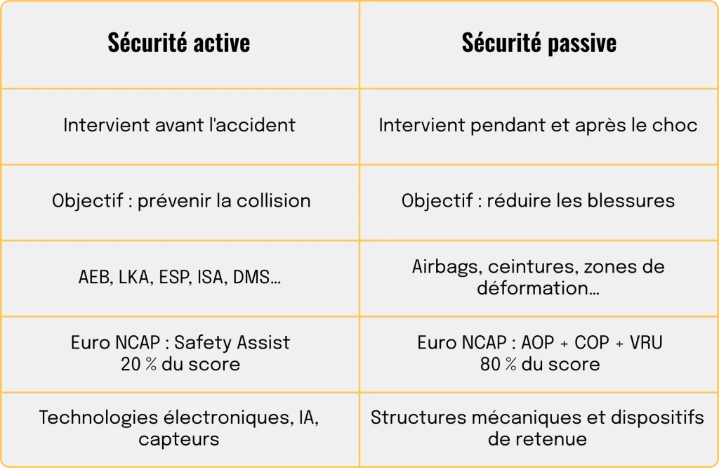 → Sécurité PASSIVE = agit PENDANT / APRÈS le choc → Euro NCAP : AOP + COP + VRU (80 %)